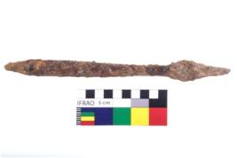 | Description / विवरण | A complete specimen of iron chisel without the ring, bulbous shoulders, pointed tang a long blade, working end bevelled but short and flat. |