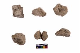 | Description / विवरण | 1 The sealing has a fragmentary impression of the concentric circles. 2 The sealing has a fragmentary impression of three parallel lines. 3 and 4 No impression is visible. 5 The sealing has a partial impression of a very mashed concentric circle. 6 The sealing has a partial impression of part of concentric circles or perhaps the middle of spiral. |