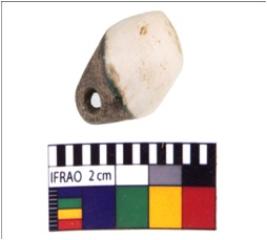 | Description / विवरण | Intact, ovular shaped pendant, slant on perforated sides, two colour stone brown and white |