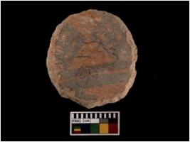 | Description / विवरण | An unperforated disc over whoch red colour slip has been applied over which paintings in black has been executed. |