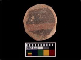 | Description / विवरण | An unperforated disc over whoch red colour slip has been applied over which paintings in black has been executed. |