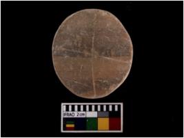 | Description / विवरण | An unperforated disc over whoch red colour slip has been applied over which paintings in black has been executed. |
