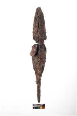 | Description / विवरण | A partially broken specimen of iron spearhead. It is rusted. |