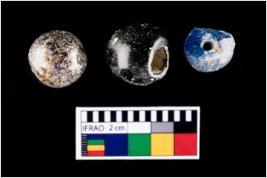 | Description / विवरण | Three globular shaped beads with perforations. |