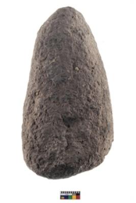 | Description / विवरण | A partially broken specimen of a oval shaped muller stone with oval section and concave end . |