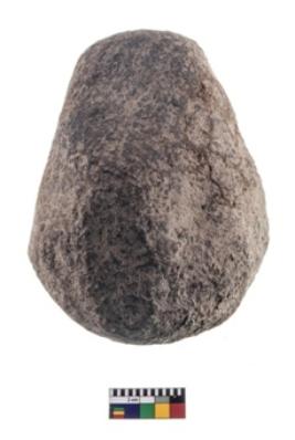 | Description / विवरण | A partially broken specimen of roughly round shaped hammer stone with battered periphery along with the circumference |