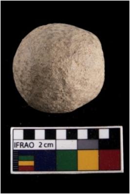 | Description / विवरण | A complete specimen of a round shaped sling ball made up from sandstone. |