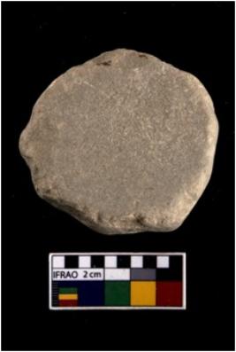 | Description / विवरण | A partially broken specimen of a stone disc object made from sandstone. The edge of the disc is partially broken and one side of the disc is having smooth surface ehreas other side is rough |