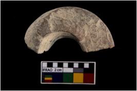 | Description / विवरण | A partially broken specimen of a stone disc object made from sandstone. The central of the disc contains a perforation. |
