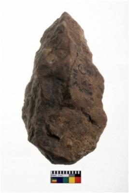 | Description / विवरण | Pear shaped hand axe with flake marks on both sides |