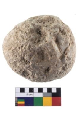 | Description / विवरण | A partially broken specimen of roughly round shaped hammer stone with battered periphery along with the circumference |