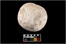 | Description / विवरण | A complete specimen of a spherical shaped hammer stone with battered surface. It is made from Quartz |