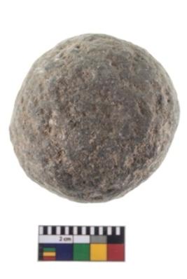 | Description / विवरण | A partially broken speciemen of stone sling ball, small in size, flat base and with smooth surface. |