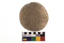 | Description / विवरण | A partially broken specimen of a spherical shaped hammer stone made up from quartz with flat end |