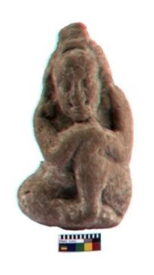 | Description / विवरण | Seated figurine, head gear is clearly visible, one leg is folding and both the hands are kept on the knee |