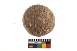 | Description / विवरण | A partially broken specimen of a spherical shaped sling ball made up from sandstone. |