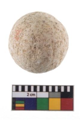 | Description / विवरण | A partially broken speciemen of stone sling ball, small in size, flat base and with smooth surface. |