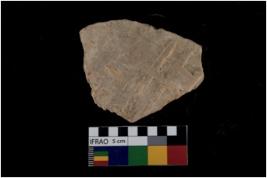 | Description / विवरण | A piece of pottery over which two horizontal applique lines and a vertical line in the middle has been made. |