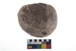 | Description / विवरण | A partially broken specimen of roughly round shaped hammer stone with battered periphery along with the circumference. |