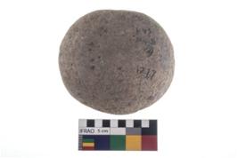 | Description / विवरण | A partially broken specimen of roughly round shaped hammer stone with battered periphery along with the circumference. |