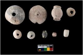 | Description / विवरण | The assemblege is made up of n 9 terracotta beads. n 1 is a typical arecanut bead with a concave base. n 1 is a tubular shaped bead. n 1 is a squat convex bead. The rest n 6 are roughly globular beads. They have perforation going through the center. |