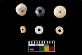 | Description / विवरण | The assemblege is made up of n 7 shell beads. two of them are a small globular bead. n 1 is a spacer bead, rectangular in shape. The rest n 4 are flat cylindrical bead. All have perforation going through the middle. |