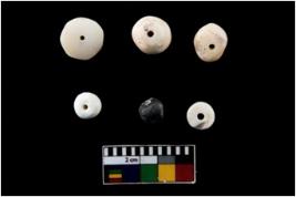 | Description / विवरण | The assemblege is made up of n 6 shell beads. two of them are a small globular bead. n 1 is a spacer bead, triagular in shape. The rest n 3 are flat cylindrical bead. All have perforation going through the middle. |