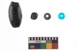 | Description / विवरण | The assemblege is made of n 6 black glass beads, they are all opaque. n 2 are small roughly globular beads. n 3 are cylindrical disc shaped beads. The largest n 1 is a cylinder shaped bead with a slight convex edge. All have single perforation going through the center. |