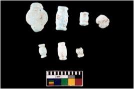 | Description / विवरण | The assemblege is made up of n 8 powder blue faience beads. n 6 of the beads are cylindrical with incised collars on both ends. They differ in sizes. n 1 is a flat barrel shaped eith incised collars on both ends. n 1 is flat dics shaped bead. they all have perforation going through their center. |