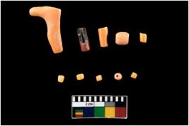 | Description / विवरण | The assemblege is made of n 7 Coral beads. n 1 is a flat barrel shaped bead. n 1 is a leg pendent shaped bead. n 5 of these are short cylindrical beads. n 2 are elongated tubular beads. They all have perforation going along their breadth. |