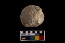 | Description / विवरण | A partially broken specimen of a spherical bird shot with a flat base .It is made up from sandstone |