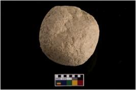 | Description / विवरण | A partially broken specimen of a circular sling shot with a flat base .It is made up from quartz |