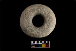 | Description / विवरण | A partially broekn specimen of a circular shaped net sinker with abrasion marks and perforation at the center. It is made from Schist. |