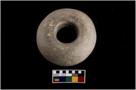 | Description / विवरण | A complete specimen of a circular shaped net sinker with abrasion marks and perforation at the center. It is made from Granite. |