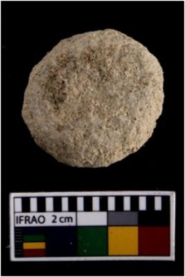| Description / विवरण | A complete specimen of a circular shaped sling ball with flat base made up from snadstone |