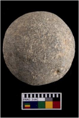 | Description / विवरण | A complete specimen of a circular shaped sling ball with flat base made up from snadstone |