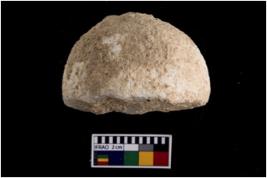 | Description / विवरण | A partially broken specimen of a circular shaped sling ball made up from snadstone |