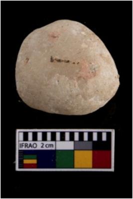 | Description / विवरण | A complete specimen of an oval shaped stone sling shot made up from quartz. |