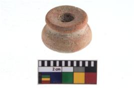 | Description / विवरण | A partially broken specimen of a red ware small round teracotta bobbin shaped ear stud.It consists of two terracotta rings placed one top of the other and joined with a slight waist . It is made of fine clay and well fired.The rings are of unequal sizes. It also has a tubular perforation in the centre |