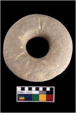 | Description / विवरण | A complete specimen of a circular shaped net sinker with abrasion marks and perforation at the center. It is made from Schist. |