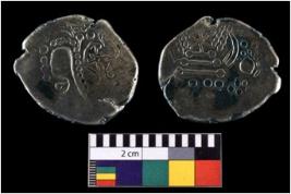 | Description / विवरण | The silver coin is roughly round in shape. Obverse stylized kings bust. Reverse Fire altar. |