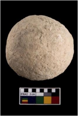 | Description / विवरण | A partially broken specimen of a round slingball made up from quartz. |