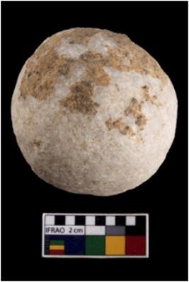 | Description / विवरण | A complete specimen of a round slingball made up from quartz. |