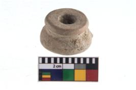 | Description / विवरण | A partially broken specimen of a red ware small round teracotta bobbin shaped ear stud.It consists of two terracotta rings placed one top of the other and joined with a slight waist . It is made of fine clay and well fired.The rings are of unequal sizes. It also has a tubular perforation in the centre |