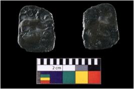 | Description / विवरण | The specimen is a roughly square Potin coin. Obverse Lion with a raised tail and two front legs raised. Three arched symbol is seen at the bottom. Brahmi Sa is visible on top. Reverse indistinctive. |