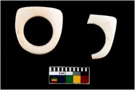 | Description / विवरण | The assemblege is made up of n 2 specimen of shell rings. They are oblong at one end and flat on the other end. The has a large perforation at the center. n 1 is partially broken. |