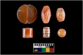 | Description / विवरण | The assemblege is made up of n 6 specimen of carnelian beads. n 2 are cylinder shaped beads. Of these beads has three parallel, white coloured lines along its breadth. n 2 are ellipsoid shaped beads. n 1 is a spherical bead. And n 1 is a large flat disc shaped bead. |