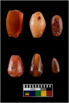 | Description / विवरण | The assemblege is made up of n 6 carnelian beads. n 2 of these are obolate shaped beads. n 1 is a flat disc shaped bead. n 3 are long convex cone shaped beads. |