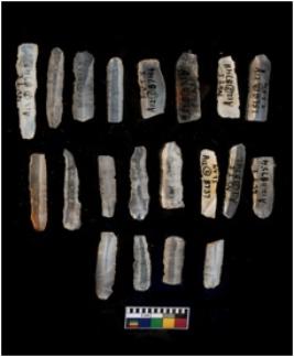 | Description / विवरण | THERE ARE TOTAL N-20 BLADES IN THE ASSAMBLANGE . ALL OF THEM ARE MADE OF CHALCEDONY WHICH HAS RETOUCHED PENKNIFE BLUNTED BACK USED AND UNUSED REJUVANATING PARRAALE SIDED FLAKE BLADES . |