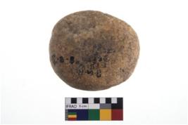 | Description / विवरण | A partially broken specimen of roughly round shaped hammer stone with battered periphery along with the circumference. It is broken from one end. |